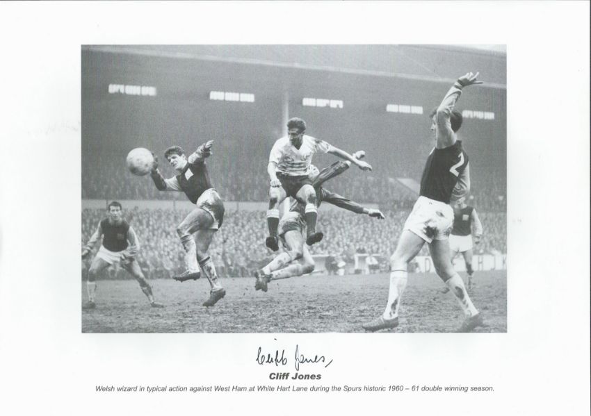 Cliff Jones signed 16x12 black and white print. Welsh wizard in typical action against West Ham at White Hart Lane during Spurs historic 1960 61 double winning season. Good condition Est.