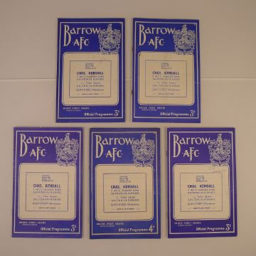 5 x Barrow 1957-58 football programmes, Vs Chester Mar 30 1957, Vs Gateshead Dec 7 1957, Vs Chester Feb 15 1958, Vs Halifax Apr 26 1958 and Vs Torquay Nov 29 1958, all in good condition. May show some light signs of age, written on scores etc - please see detailed photographs. Single programme £4.99 UK, £6.99 Europe, £9.99 ROW. We can ship a parcel up to 20kg in UK £12, EUROPE £39.99, ROW, £59.99